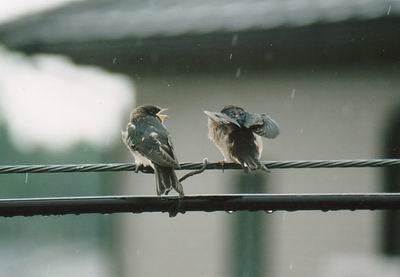 巣を離れた燕の子は親鳥と一緒に飛び回っています。