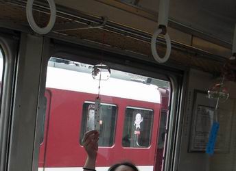 電車の網棚に結びつけ、折り紙の花や金魚、手裏剣などを車両の壁に貼り、