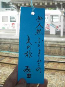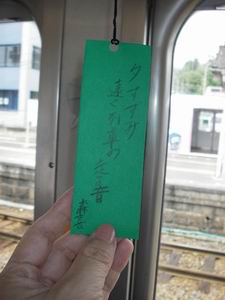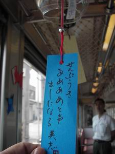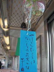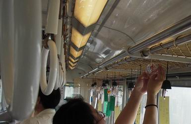 風鈴の舌(ぜつ)に結びつけ、乗客の邪魔にならないようにと考慮しつつ