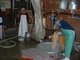 明治20年創業の橋本酒造さんの4代目、橋本勝誠さんは東京農大在学中に全国の有名蔵元が世に出す吟醸酒を目 の当たりにされいつかは自分もと、熱い思いをもたれていました。卒業後は酒造メーカーに11年間勤務され、家業を 継ぐため1996年に帰郷、自ら杜氏を兼ねコツコツと研究や経験を重ねられ、99年以降は全国新酒鑑評会で6度の 金受賞の常連蔵となる 橋本酒造さんの生産量はごく少量ですべて手作業による丁寧かつ、熱意、愛情、妥協の無いこだわりが注ぎ込 まれたお酒です。それに忘れてはならないのは奥さんの真貴子さんの存在!!造りは勿論、真貴子さんの笑顔が橋本 酒造さんのお酒造りの秘伝となっているように思います。 友人との仕込みお手伝いの様子 |