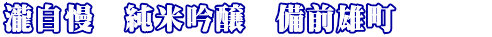 | 原料米:備前雄町 精米歩合:50% 使用酵母:蔵内自家培養 アルコール度:16度 日本酒度:+4 酸 度:1.2 720ml:2,090円(税込) 1800ml:4,180円(税込) |