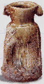 | 灰かぶり・焼締め・ビードロ 振りかかった薪の灰が、高温の炎の中で溶かされる。あるいは流れて緑色の雫となる。すさまじい炎の力に飾られた無釉焼く締めのつわものの顔。 |