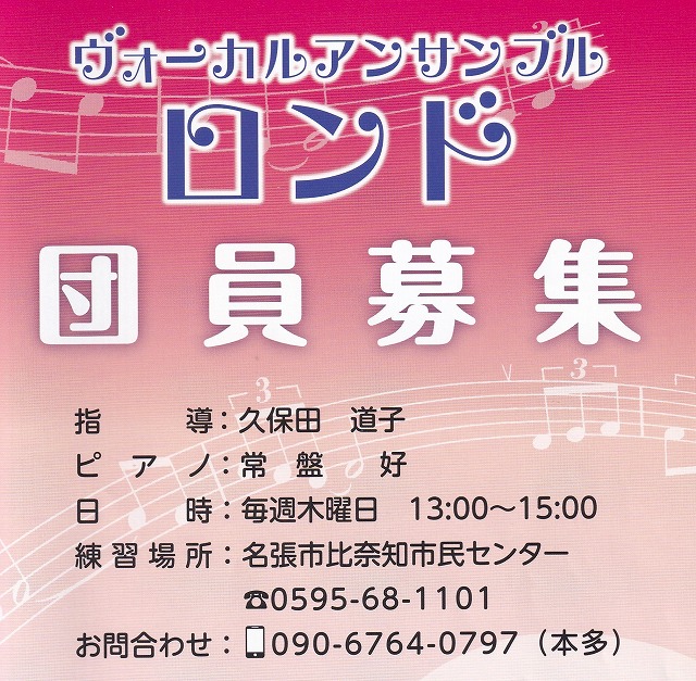 団員募集のご案内 ヴォーカルアンサンブル ロンドでは、2027年3月開催予定の第13回定期演奏会に向けて練習を始めています。 私たちと一緒に歌いませんか。 見学、入会の方は練習会場にお越し下さい。 皆さんの参加をお待ちしています。 プロフィールへ