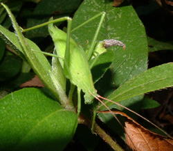 | 脱皮してすぐのオンブバッタ。 前ばねがまだ、のびきっていなくて腹部が、見え ています。見るからに柔らかく撚れているようにも見えます。 |
